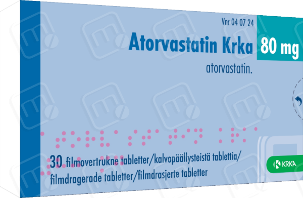 - Det aktive stof er atorvastatin. Hver Atorvastatin Krka 80 mg filmovertrukket tablet indeholder 80 mg atorvastatin som atorvastatincalcium.