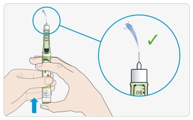 • Når der kommer insulin ud af nålespidsen, fungerer pennen korrekt.