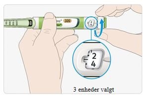 A Vælg 3 enheder ved at dreje dosisvælgeren indtil dosisviseren er ved mærket mellem 2 og 4.