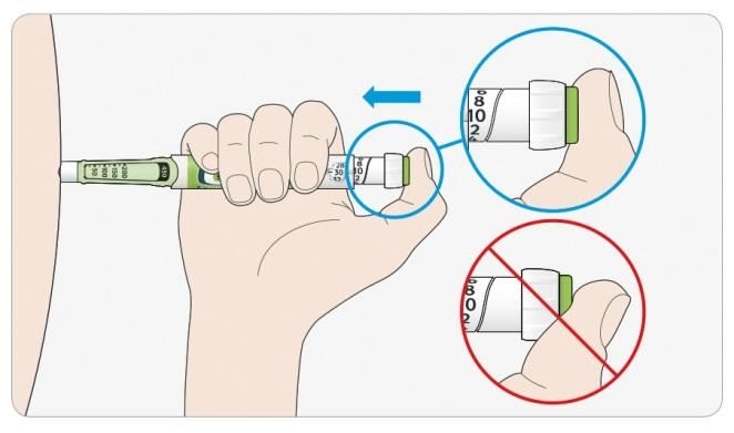 • Du kan ikke dreje doseringsskalaen forbi antallet af enheder, der er tilbage i pennen.