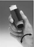 Ryst inhalationssprayen grundigt, og hold den væk fra dig, idet du trykker et pust ud i luften. Gør det igen, hvis inhalationssprayen ikke har været brugt i en uge eller mere.